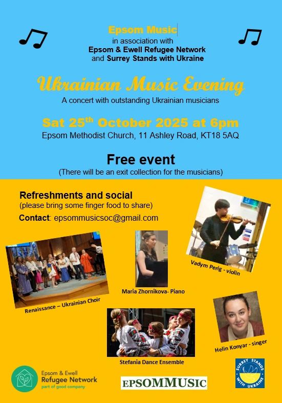 The next Ukrainian Music Evening will take place on Saturday 25th October 2025 at 6pm at Epsom Methodist Church.