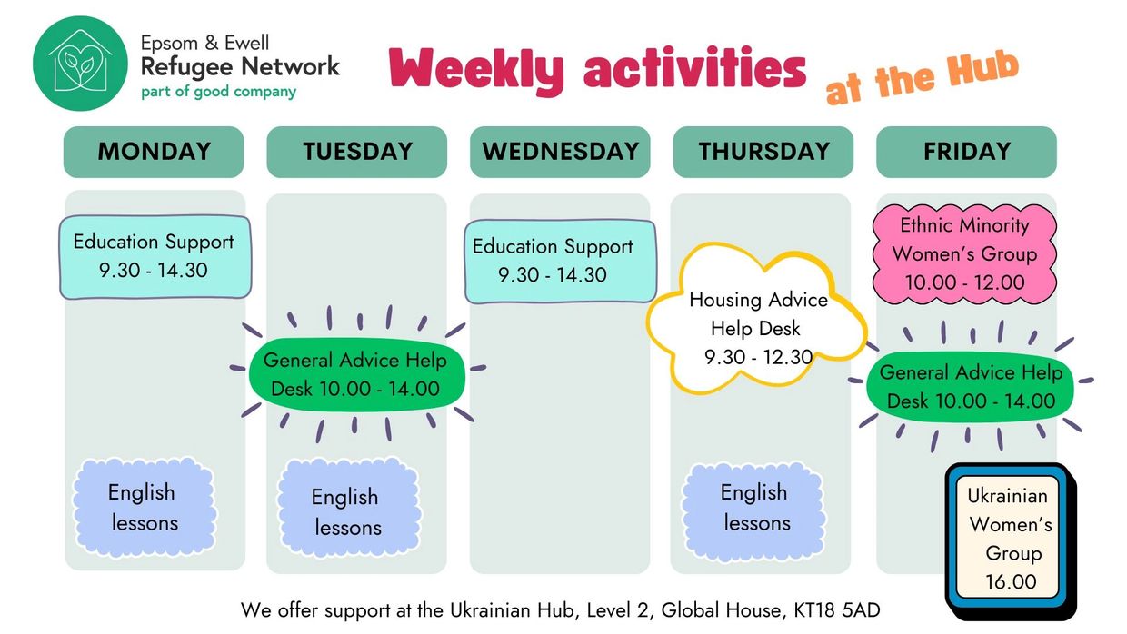 We provide a range of support and activities to refugees and asylum seekers, most of which are run from our Hub in Global House, Epsom. Our activities range from Help Desks, English lessons, Support Work, Women's Groups and social activities. Please see our weekly schedule below, and feel free to get in touch to find out more.